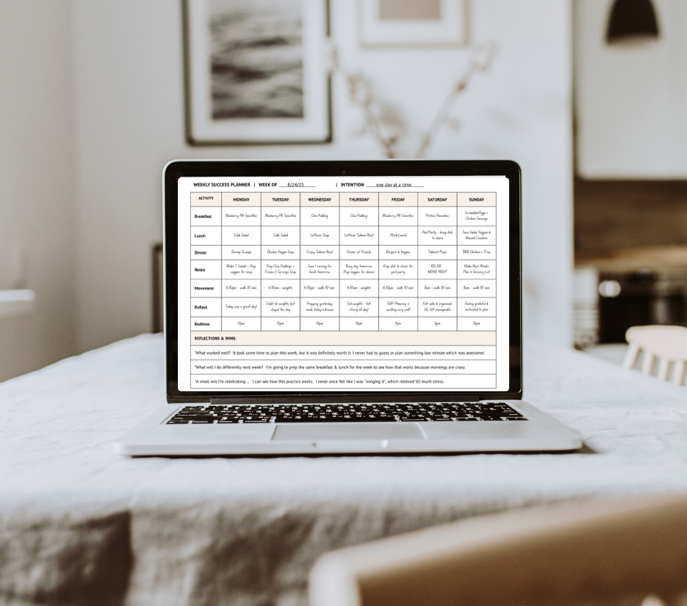 Get my free Weekly Success Planner a/k/a “my secret weapon” for organizing your week, reducing stress, and making healthy habits effortless – even on your busiest weeks. This planner is GOLD!